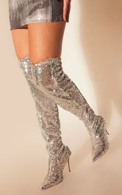 Prettylittlething Gunmetal Diamante Point Toe Fold Over Knee High Wedged Calf High Boots Gunmetal