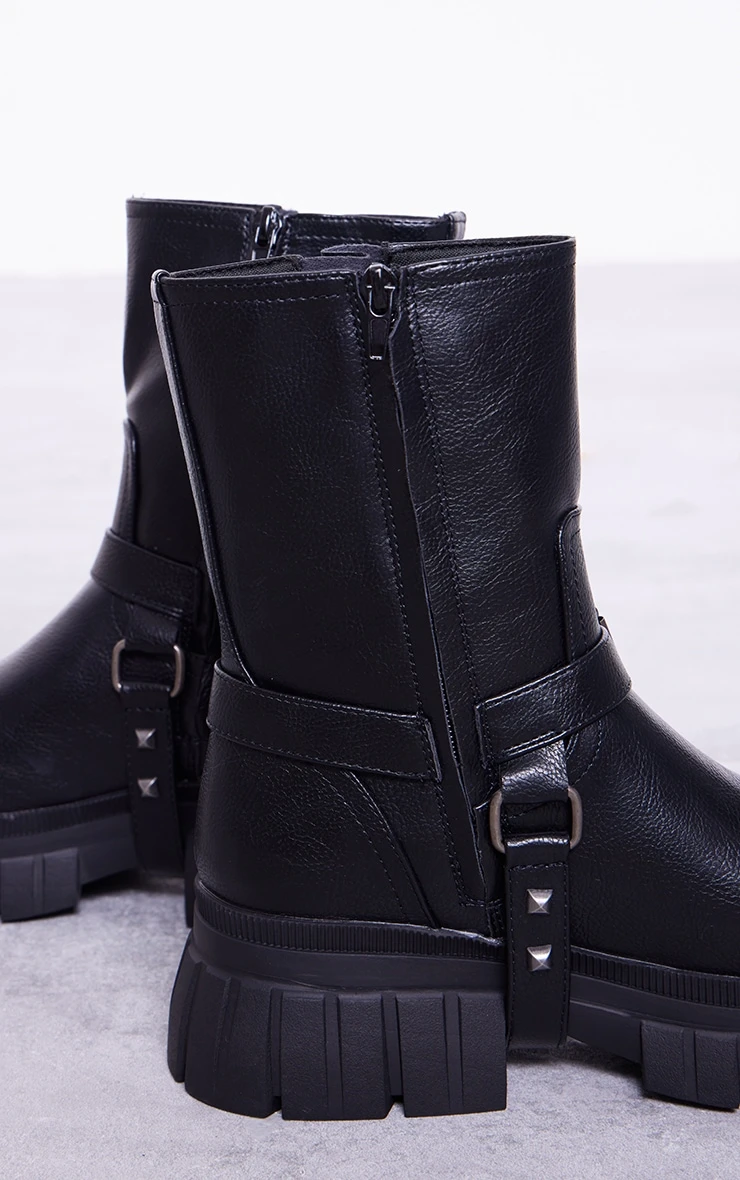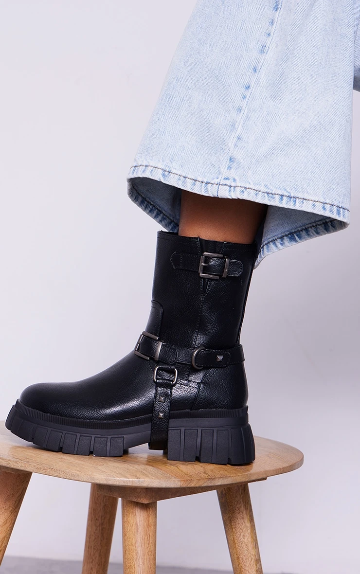Prettylittlething Black Cleated Sole Buckle Detail Ankle Boots Black