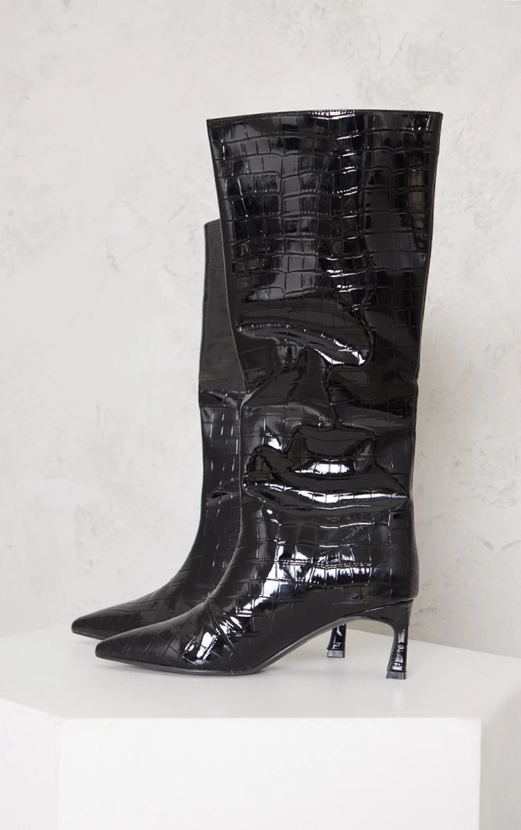 Prettylittlething Black Croc PU Point Toe Low Heeled Knee Boots Black