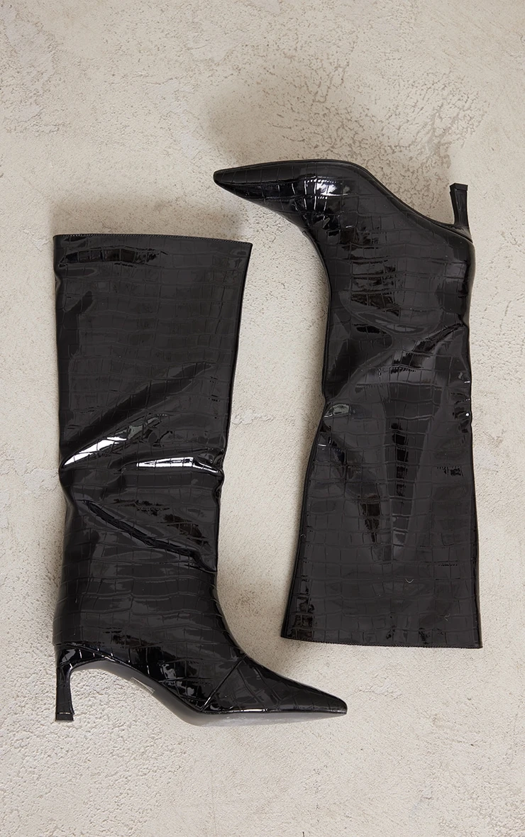Be the first to review “Prettylittlething Black Croc PU Point Toe Low Heeled Knee Boots Black” Cancel reply