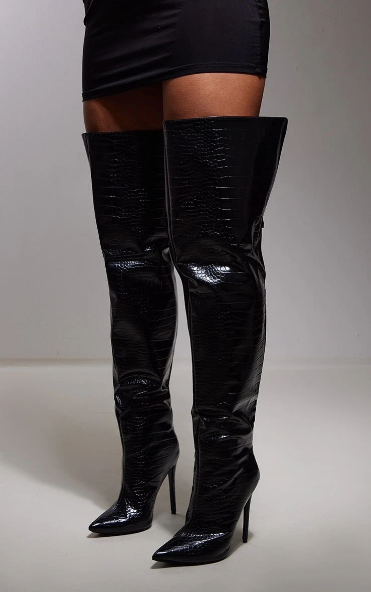 Prettylittlething Black Croc PU Pointed High Heel Over The Knee Boots Black