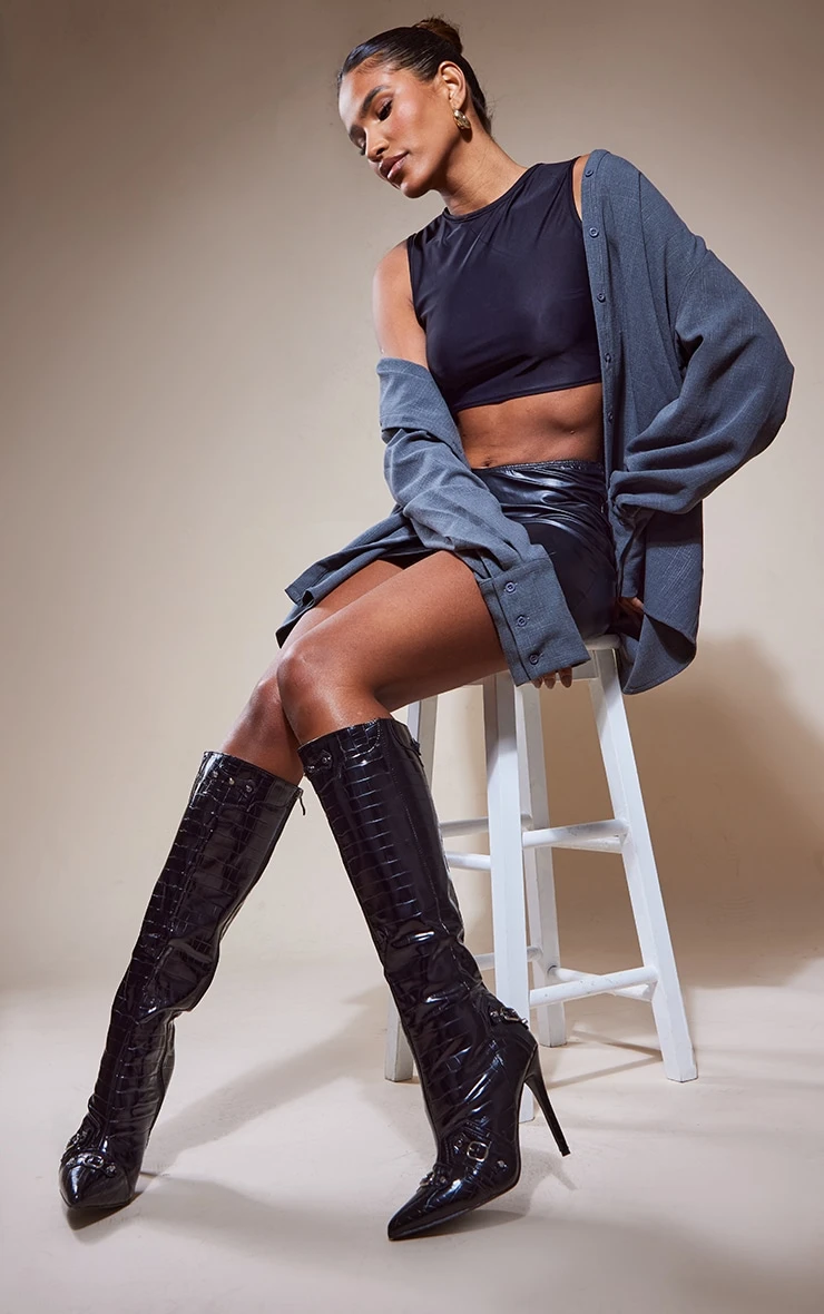 Prettylittlething Black Croc PU Pointed Stiletto Heeled Knee Boots Black