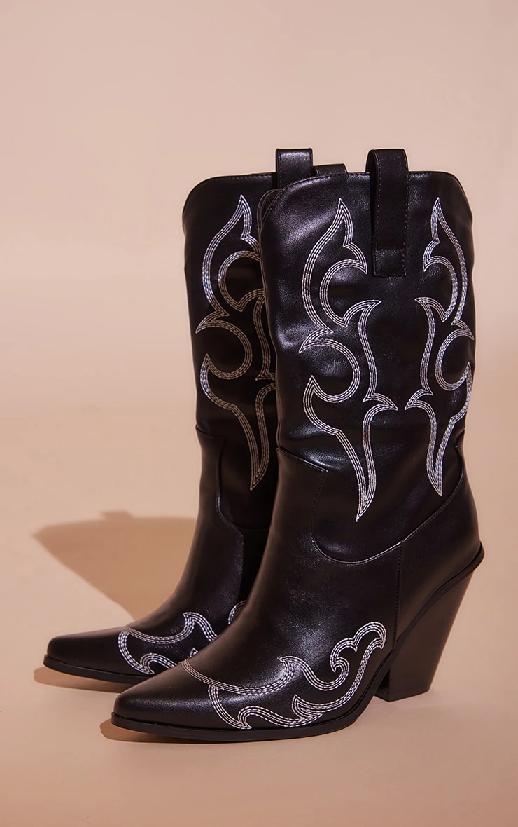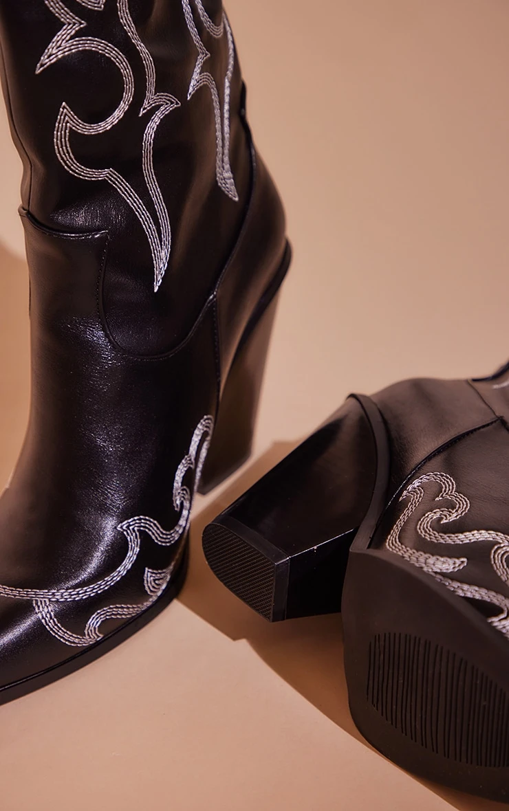 Prettylittlething Black Faux Leather Contrast Stitch Detail Western Ankle Boots Black