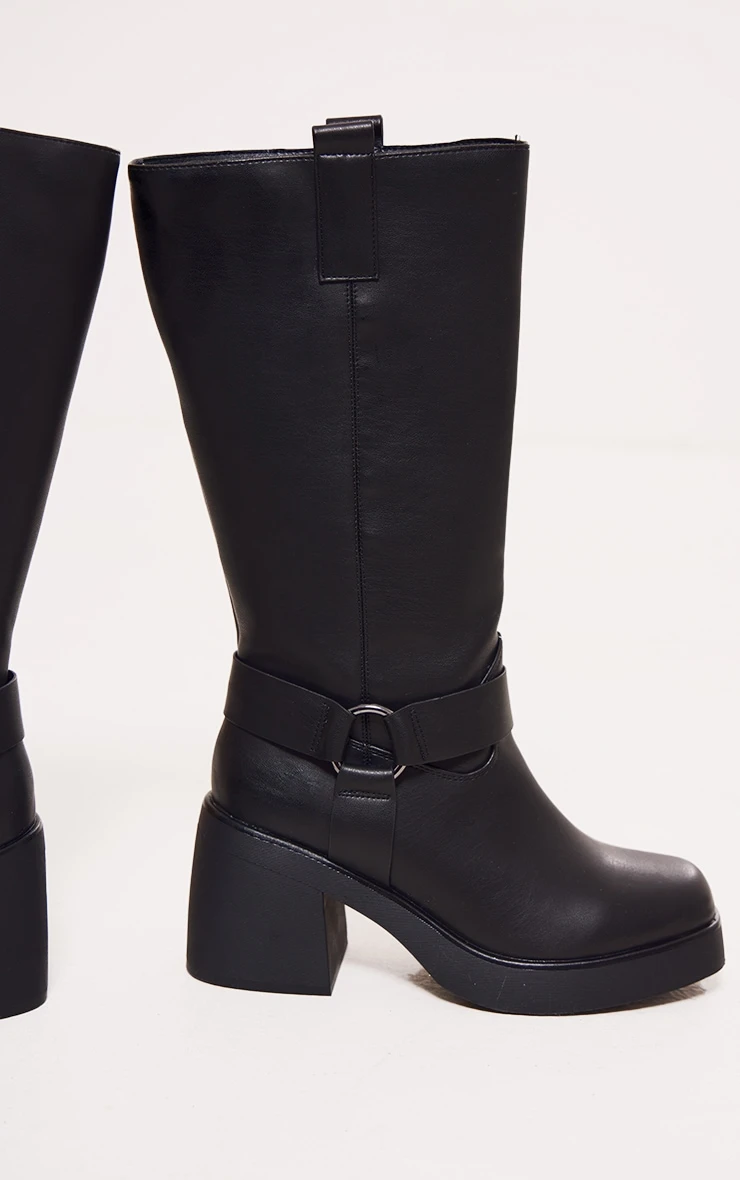Prettylittlething Black Faux Leather Square Toe Buckle Chunky Heeled Thigh High Boots Black