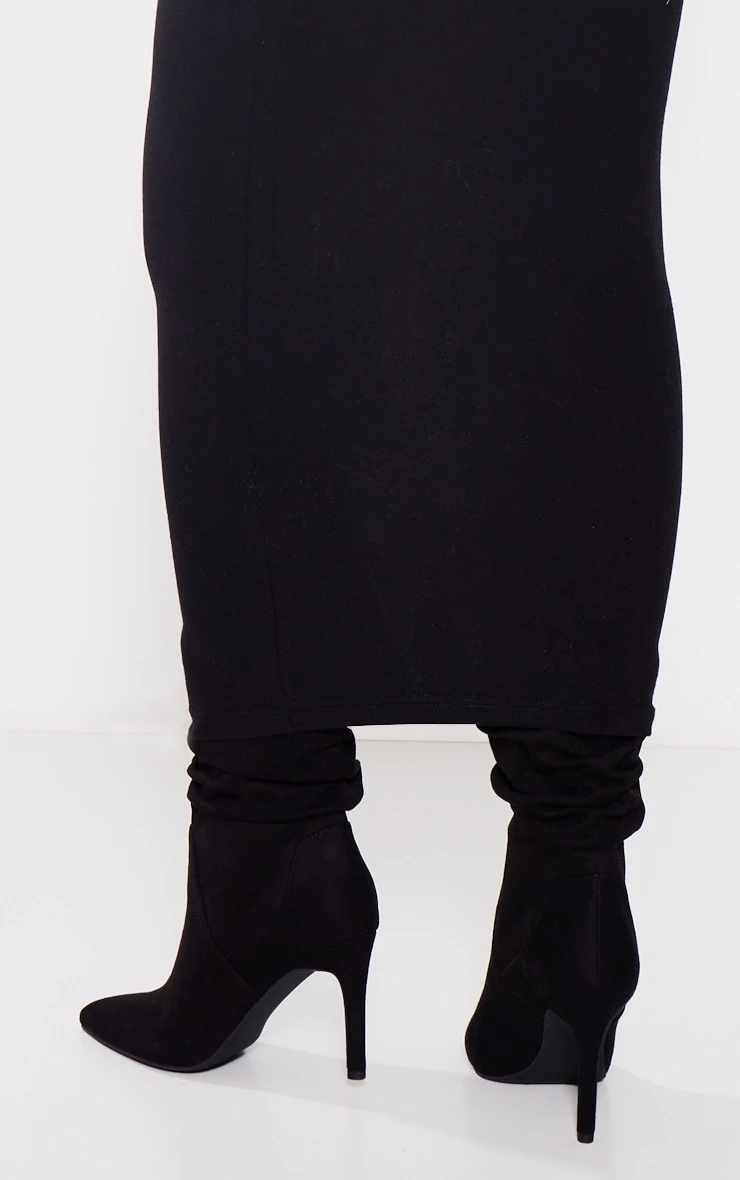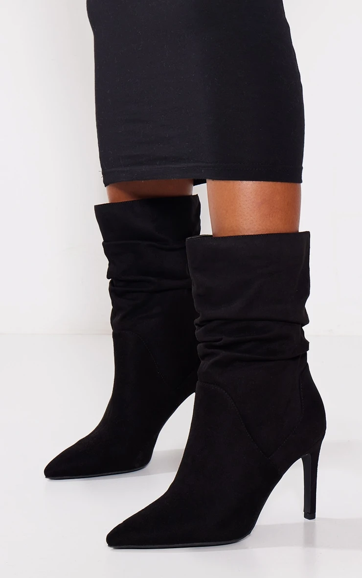 Prettylittlething Black Faux Suede Point Toe Ruched High Heeled Ankle Boots Black