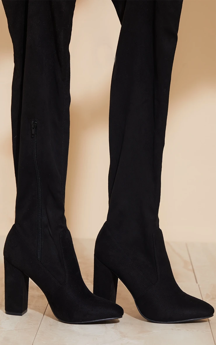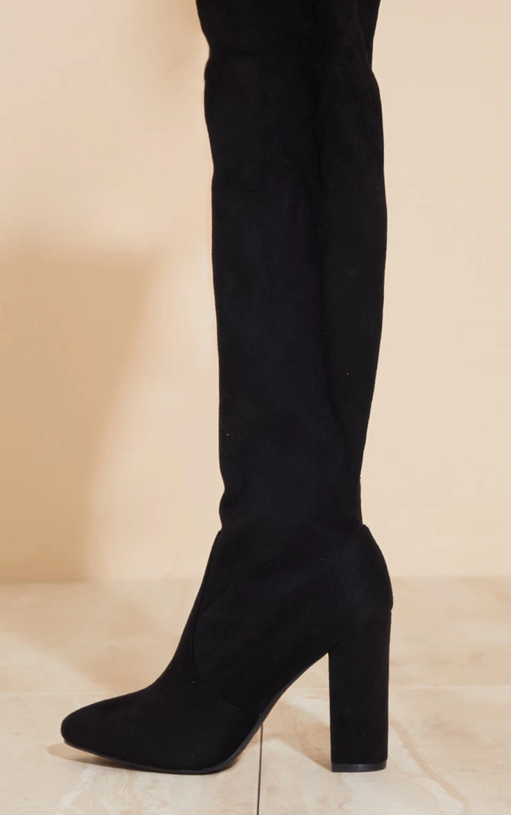 Prettylittlething Black Faux Suede Round Toe Block Heel Over The Knee Boots Black