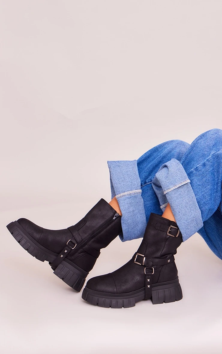 Prettylittlething Black Faux Suede Round Toe Buckle Detail Chunky Platform Ankle Boots Black