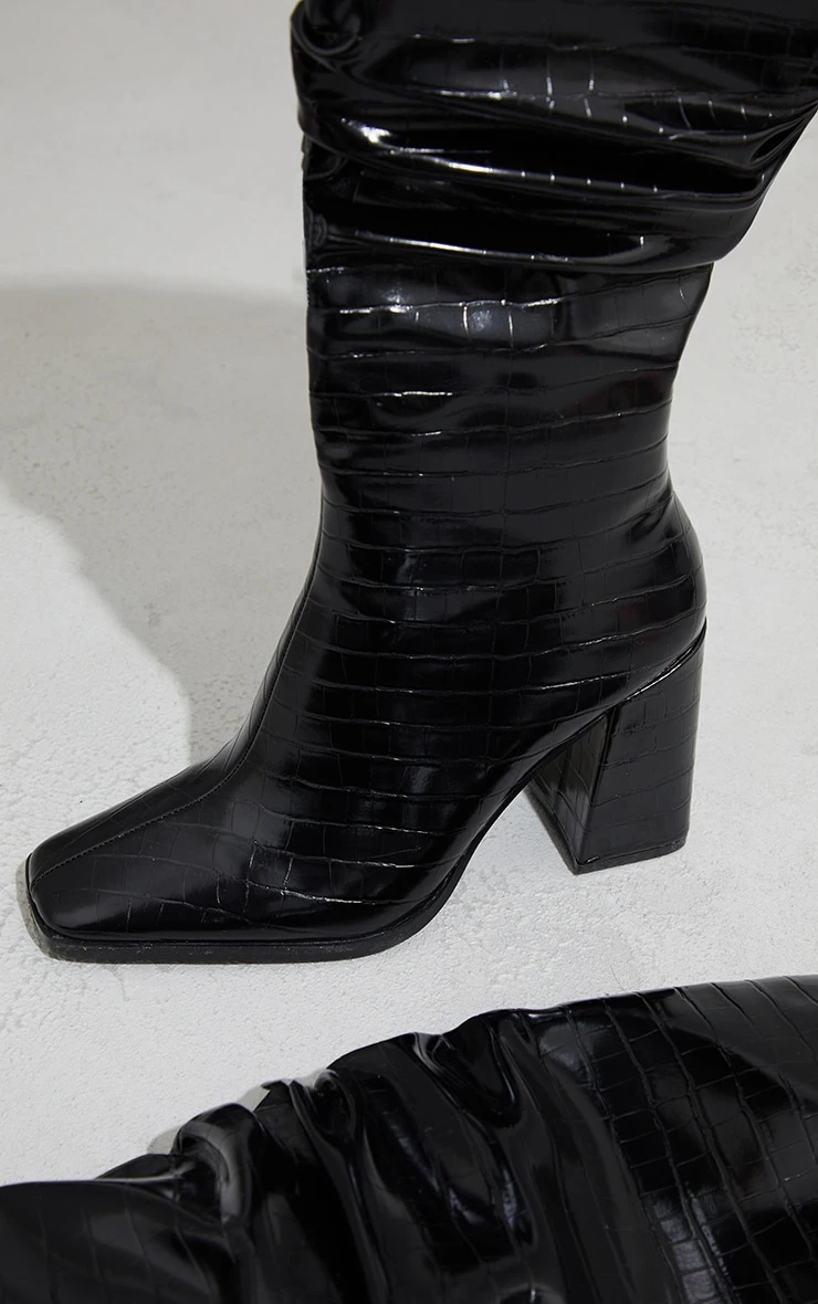 The boots are a shoe-drobe essential doll. Featuring a black material with croc detailing, a block heel and a knee high design, we’re obsessed. Add to any look for a blogger-wothy vibe.