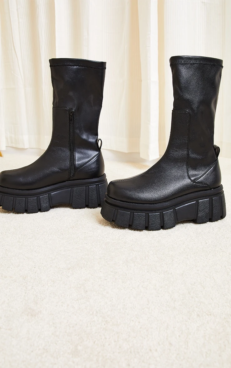 Prettylittlething Black Large Cleat Extra Chunky Sole PU Sock Boots Black