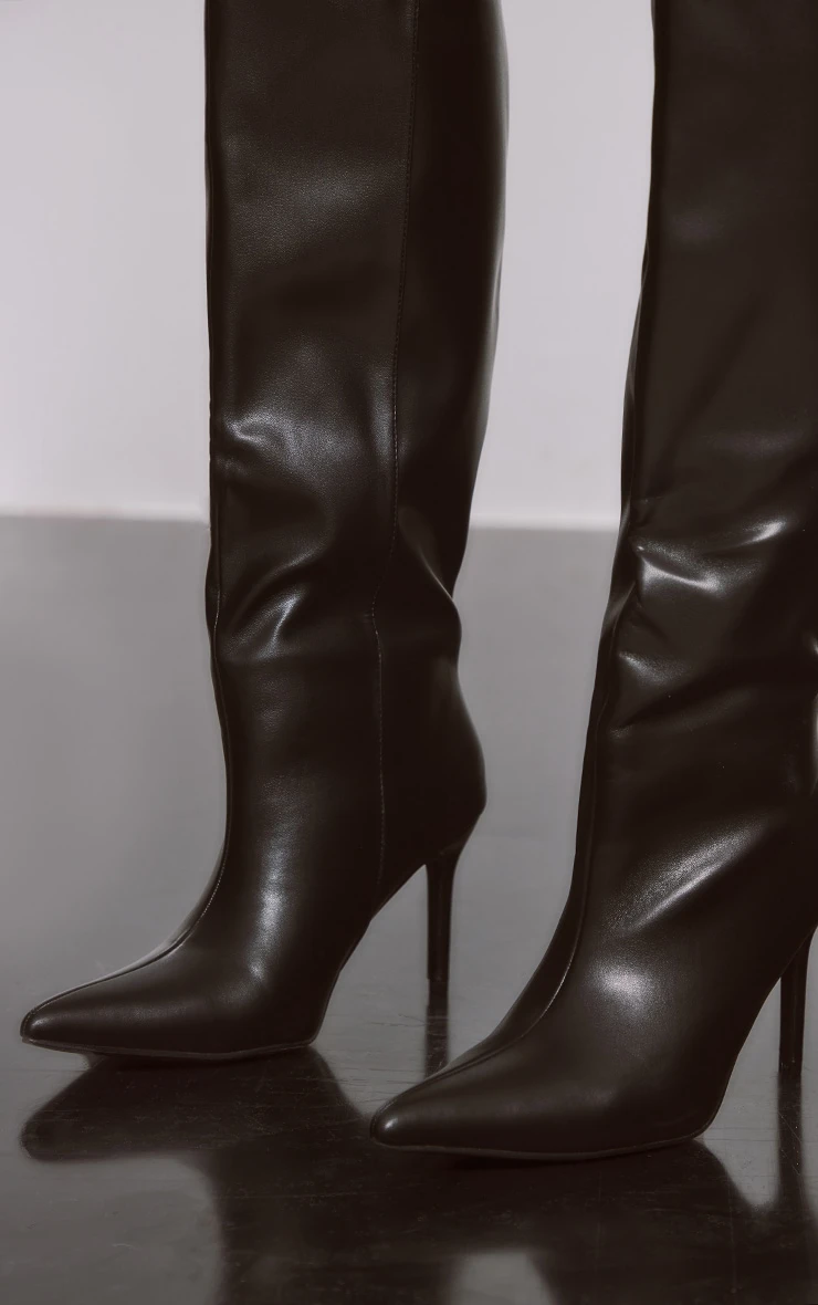Prettylittlething Black PU Detail Point Toe Stiletto Heeled Knee Boots Black