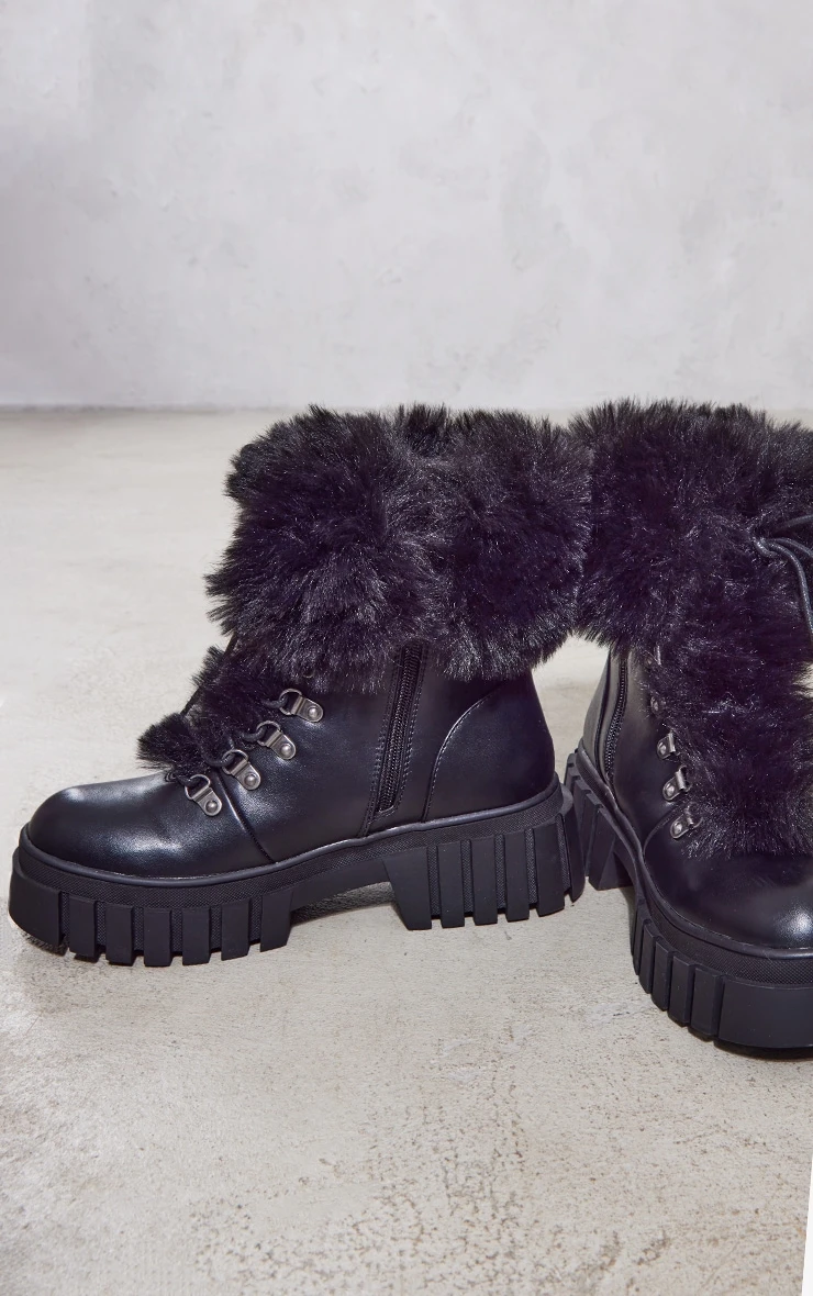 Add some seriously luxe vibes to your outfit of the day with these boots. Featuring a black PU material with a faux fur detail and a chunky ridged sole, how could you say no?