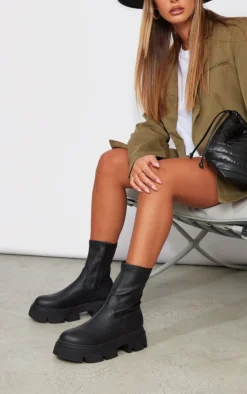 Prettylittlething Black Pu Textured Extreme Cleated Sole Ankle Sock Boots Black