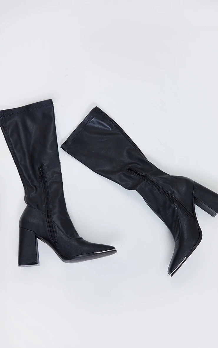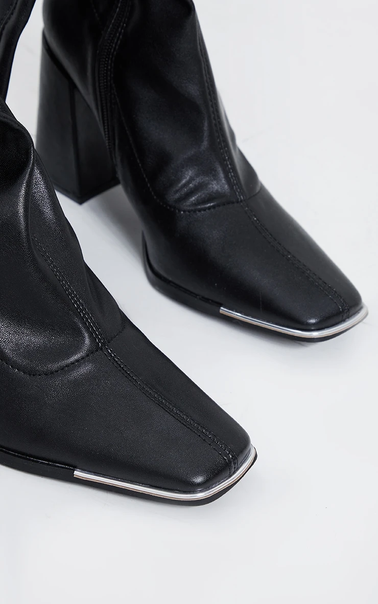 Prettylittlething Black PU Toe Cap Square Toe Calf Heeled Sock Boots Black