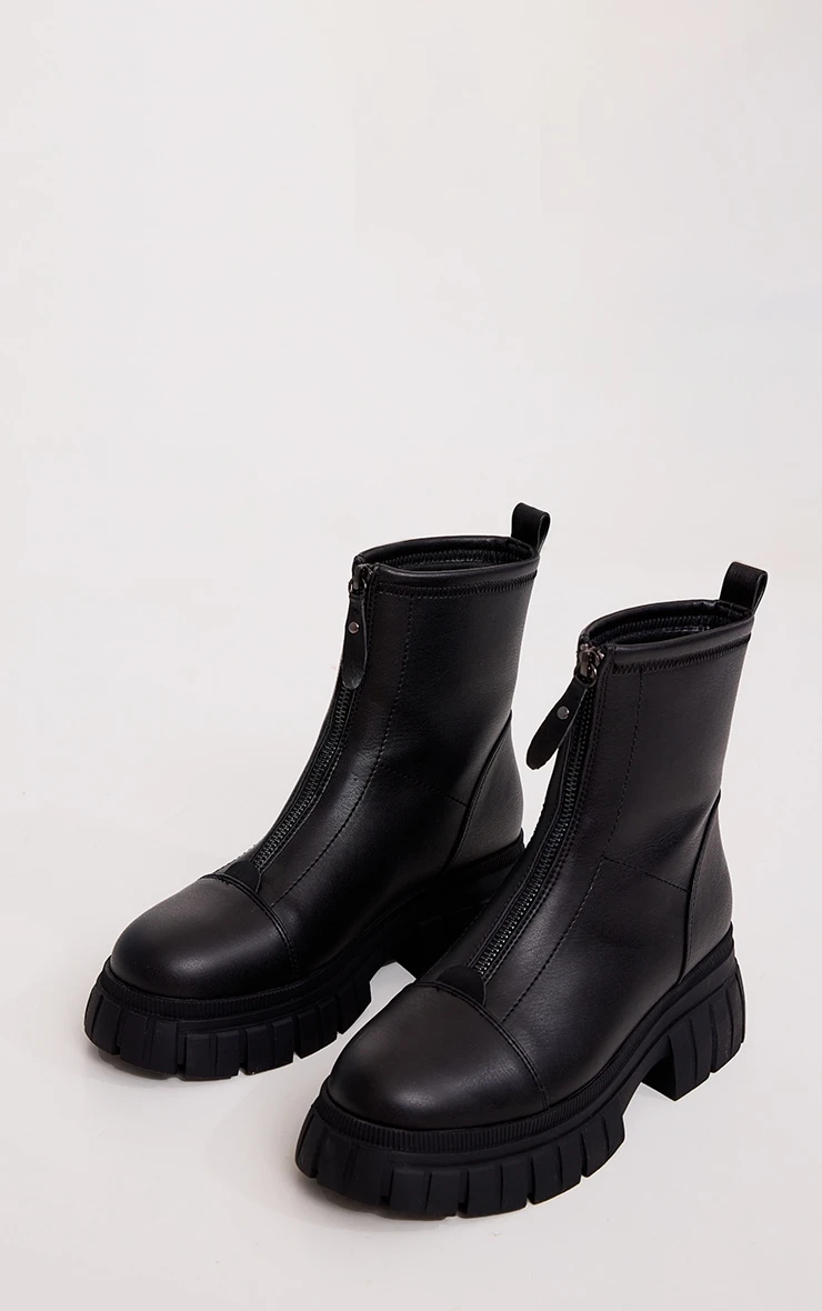 Prettylittlething Black Ribbed Chunky Sole Zip Up Ankle Boots Black
