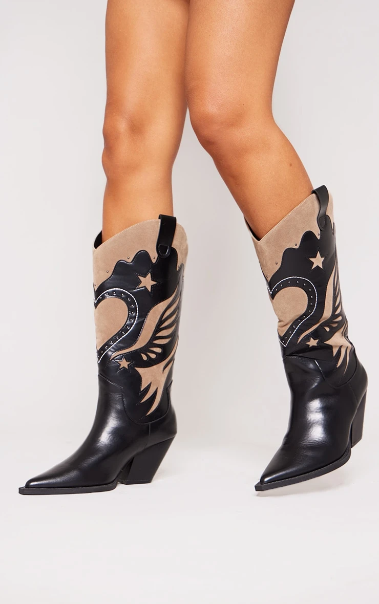 Be the first to review “Prettylittlething Black Wide Fit Faux Leather Point Toe Stitch Calf High Western Boots Black” Cancel reply