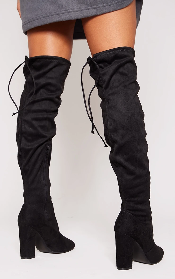 Prettylittlething Black Wide Fit Faux Suede Round Toe Block Heel Over The Knee Boots Black