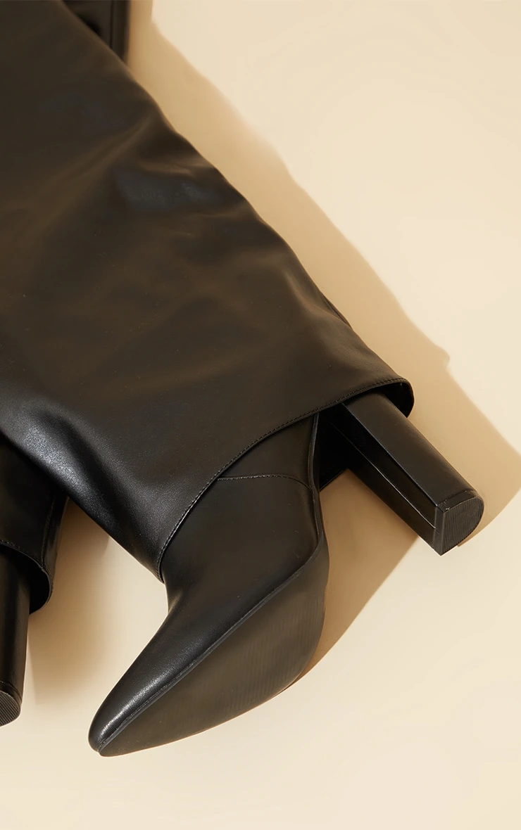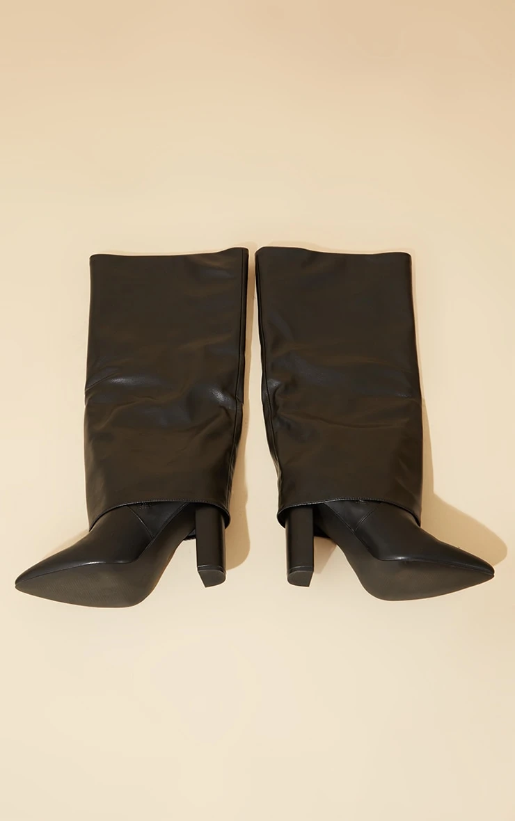 Prettylittlething Black Wide Fit Pu Pointed Fold Over Block Heel Knee Boots Black