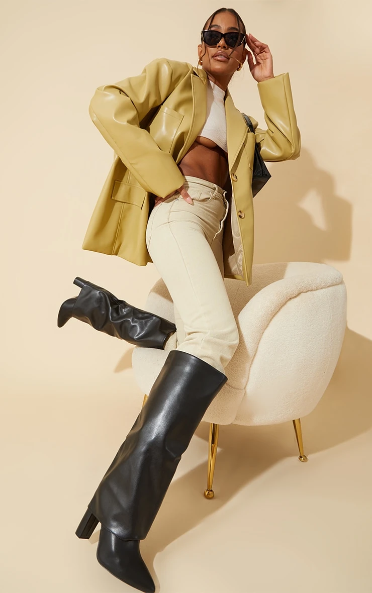 Step out in style in these must-have knee-high boots. Featuring a black PU material with a fold-over design, pointed toe, block heels and a comfy wide fit, we’re obsessed. Style with your outfit of the day to make sure all eyes are on you.