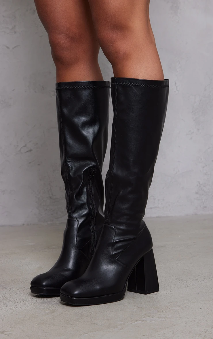 Elevate your outfit of the day with these black wide-fit slight platform high block heeled knee boots. Whether you have last-minute weekend plans or a special occasion that has been in your diary forever, these heeled knee boots are our fave choice. With a black PU material, slight platform design, and a block heel, how could you say no?