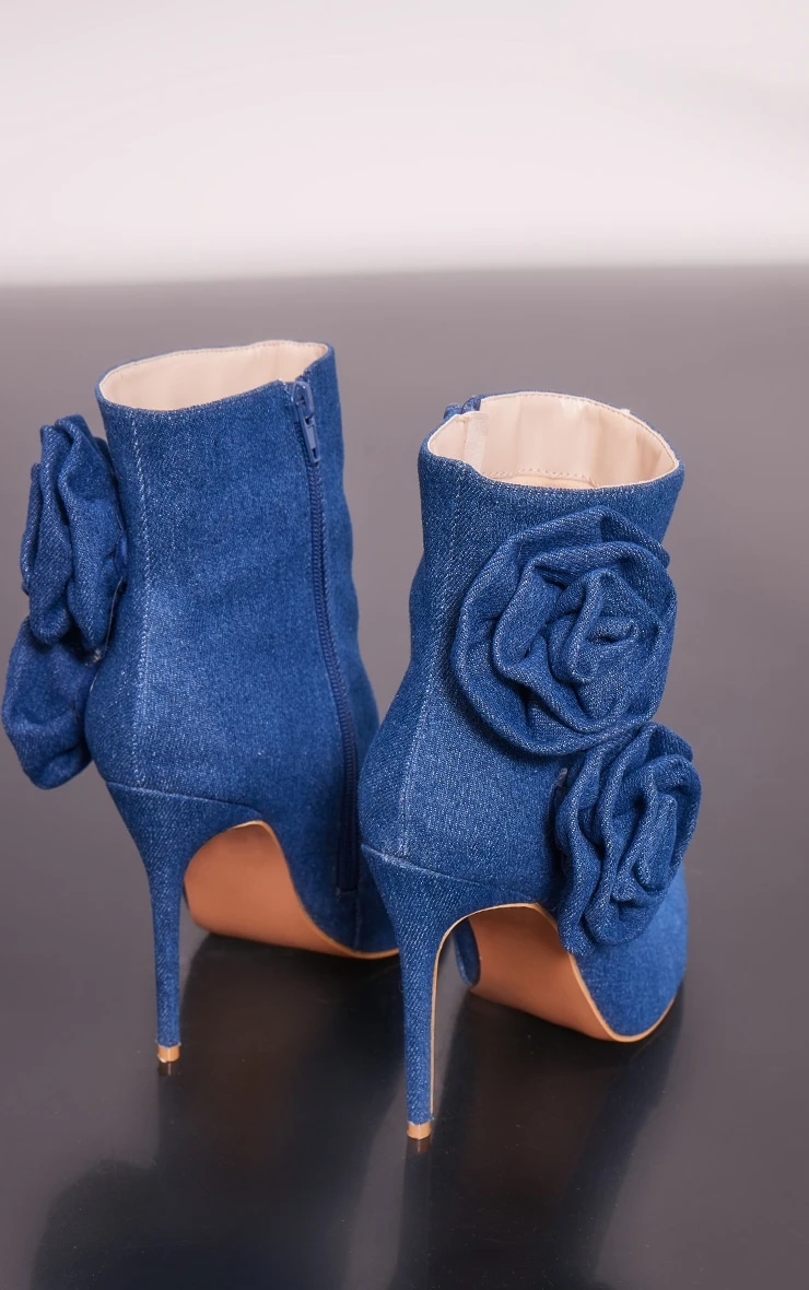 Prettylittlething Blue Denim Point Toe Corsage Detail High Heeled Ankle Boots Blue