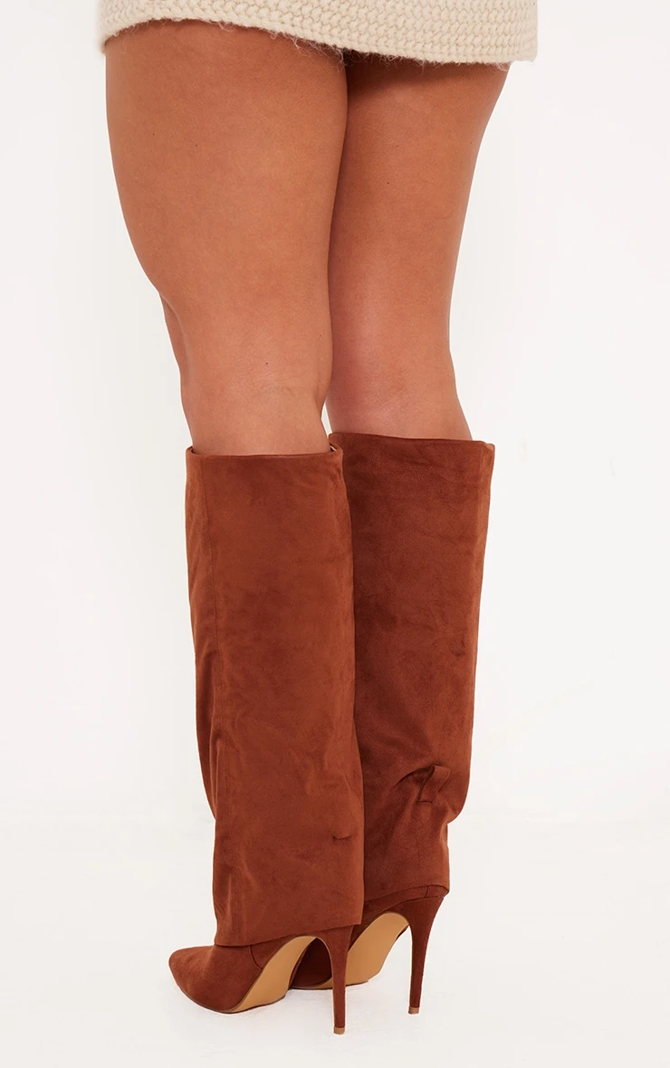 Prettylittlething Brown Faux Suede Point Toe Fold Over High Heeled Calf High Boots Brown