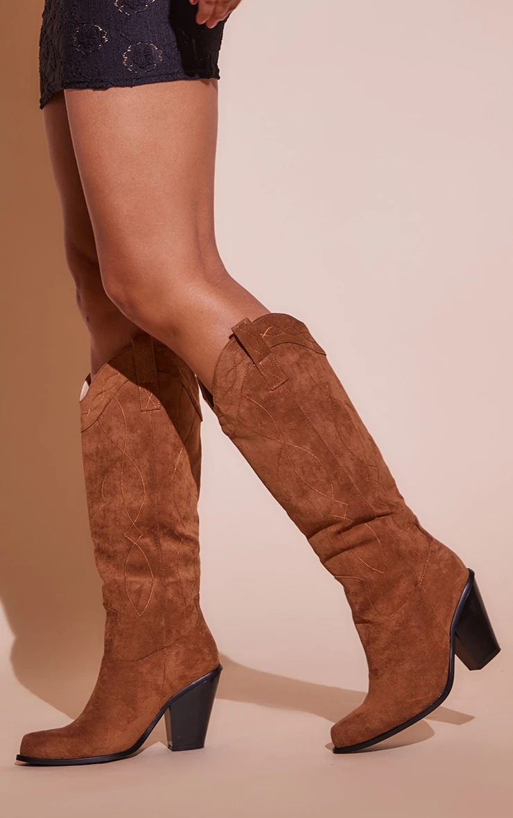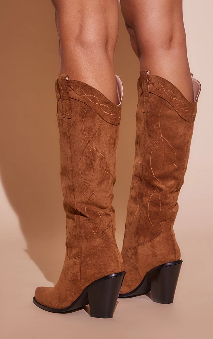 Prettylittlething Brown Faux Suede Stitch Detail Pull On Western Knee Heeled Boots Brown