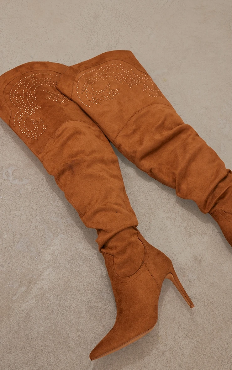 Prettylittlething Camel Faux Suede Point Toe Studded Over The Knee Heeled Western Boots Camel