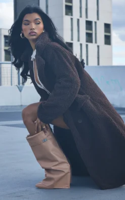 Prettylittlething Camel PU Matte Fold Over Knee Block Heeled Boots Camel