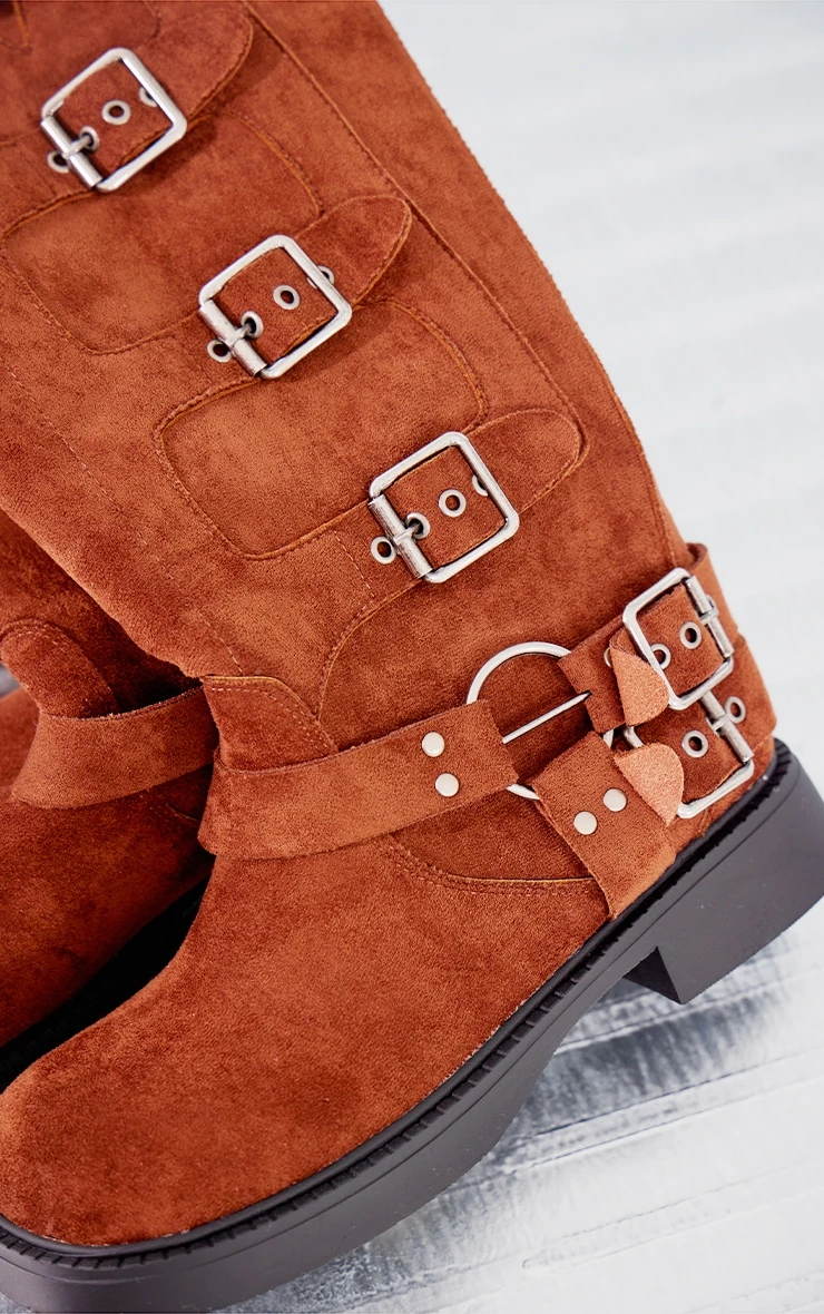 Nail major trends this season with these chocolate faux suede square toe brushed buckle knee boots. Brought to you in a chocolate faux suede material for a touch of luxe, while its square toe and buckle detailing adds the edge to your look. Team these brushed knee boots with a mini skirt and a statement jacket for an insta worthy look everyone is obsessing over this season and beyond.