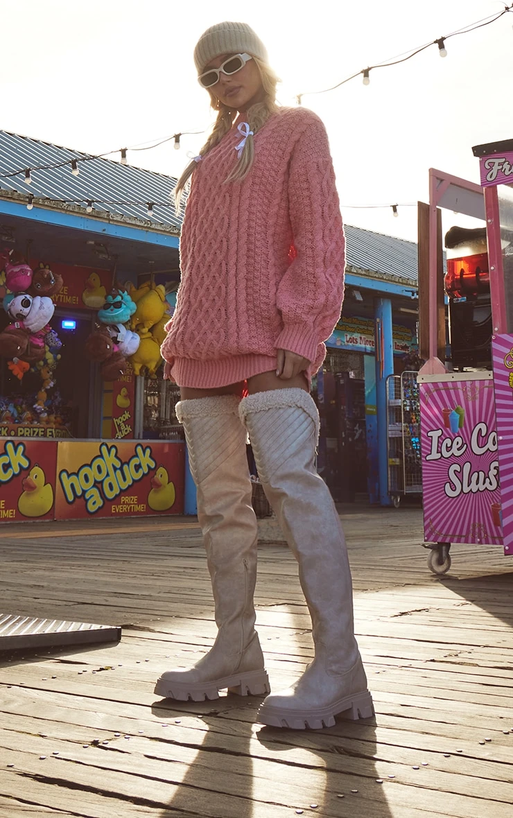 Prettylittlething Cream Faux Leather Round Toe Shearling Chunky Knee High Boots Cream