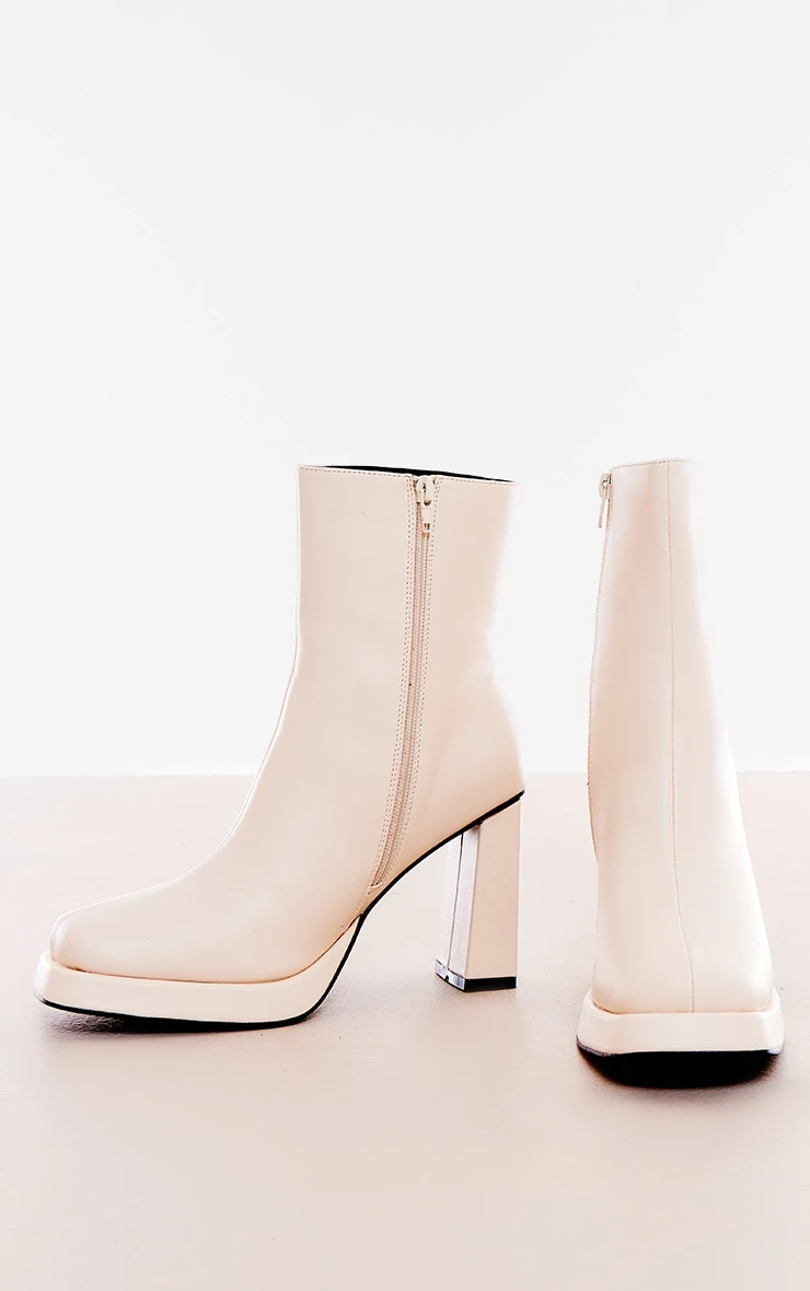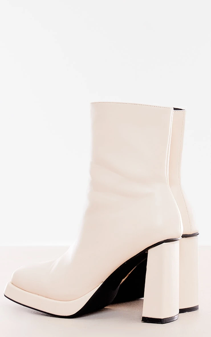 Prettylittlething Cream Faux Leather Square Toe Block Heeled Ankle Boots Cream