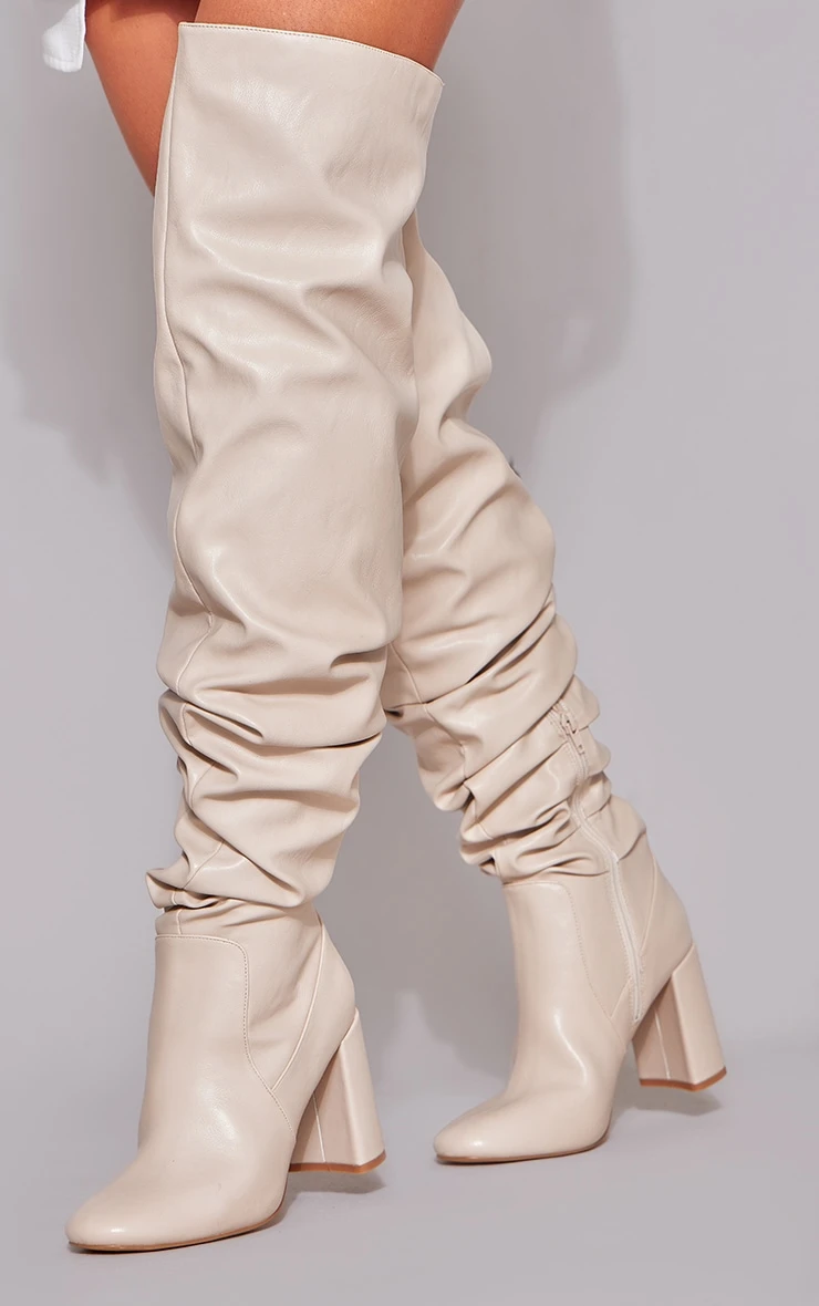 Prettylittlething Cream Matte Pu Round Toe Ruched Over The Knee Block Heeled Boots Cream