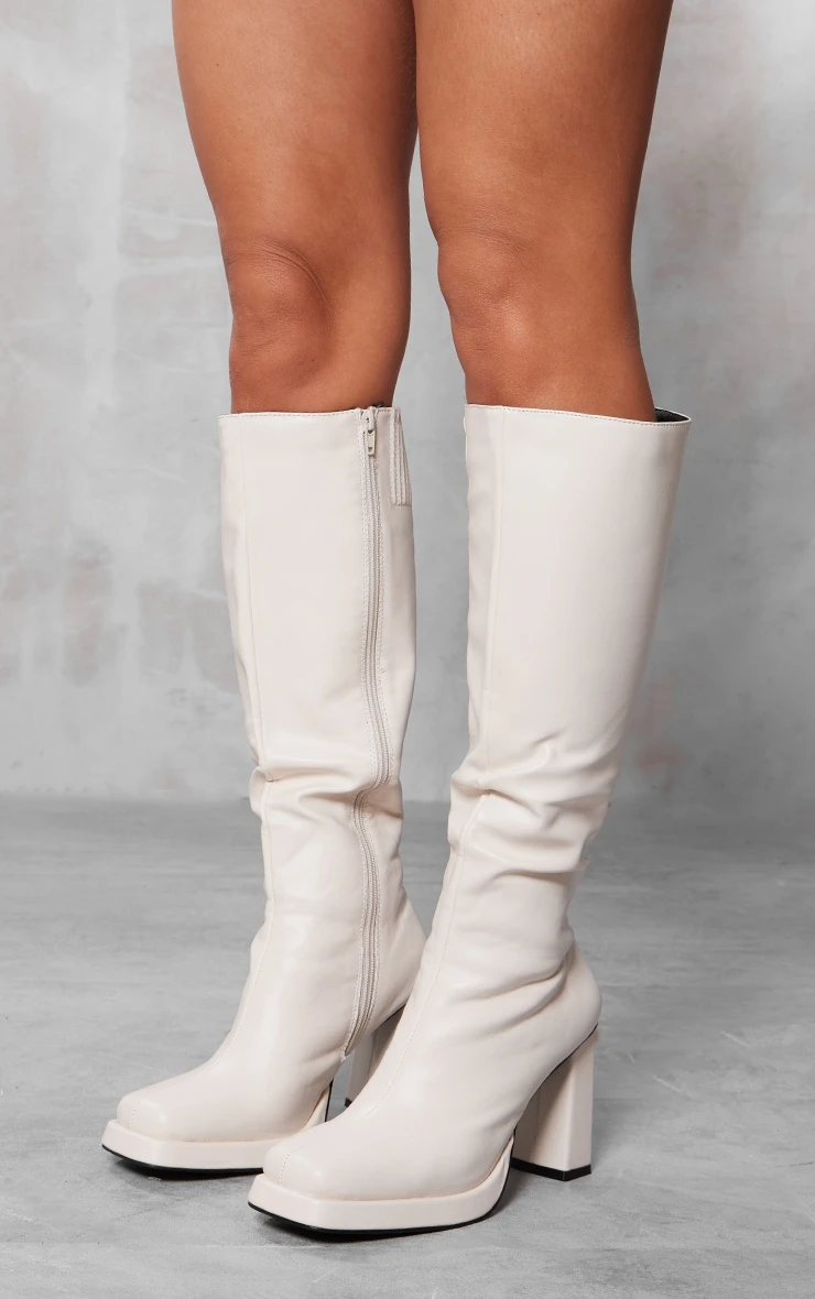 Be the first to review “Prettylittlething Cream Slight Platform Block Heel Square Toe Knee Boots Cream” Cancel reply