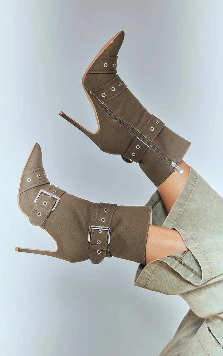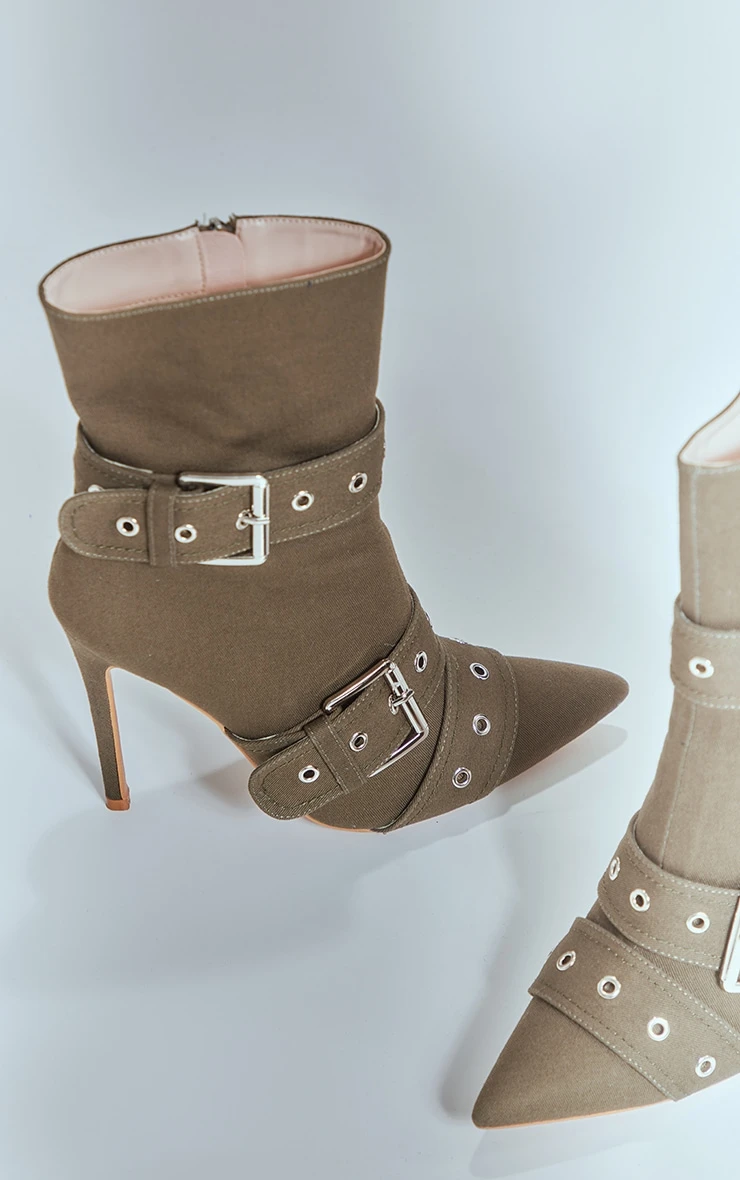 Step into the weekend in style with this khaki twill point toe buckle detail heeled ankle boots. Brought to you in a khaki hue twill material with a pointed toe design and buckle detailing, what more could you need? These heeled boots are sure to add an extra edge to your look. Style with your weekend wardrobe pieces for a fierce finishing touch.