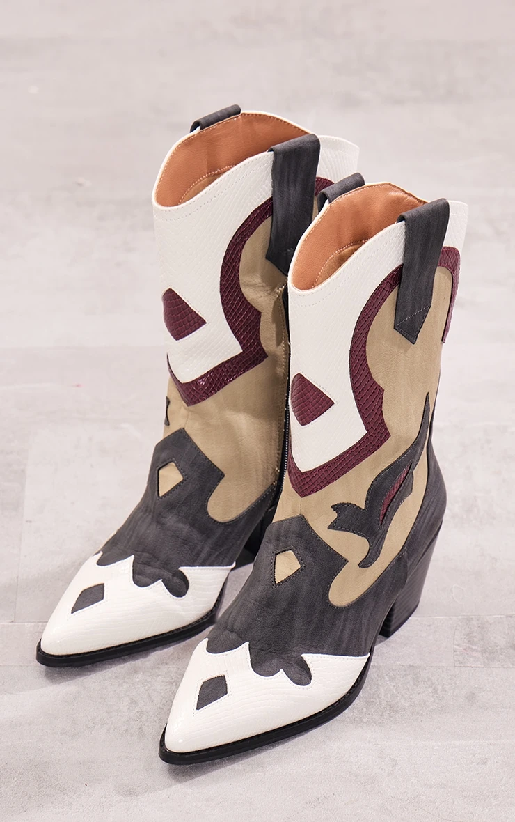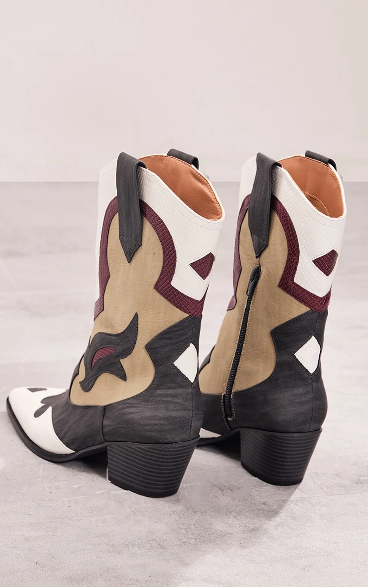 Nail all the major trends this season with these multi contrast snake print point toe western heeled ankle boots doll. Brought to you in a multi contrast snake print material with a western design, these heeled ankle points are sure to gain all the attention. Perfect for dressing up or down, these ankle boots are a yes from us.