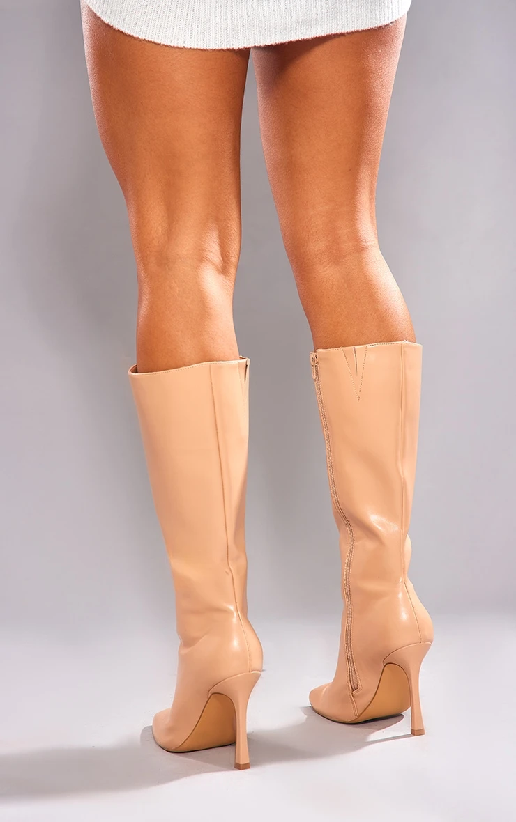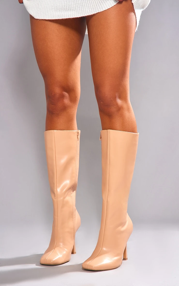Prettylittlething Nude Wide Fit Faux Leather Square Toe Heeled Knee High Boots Nude