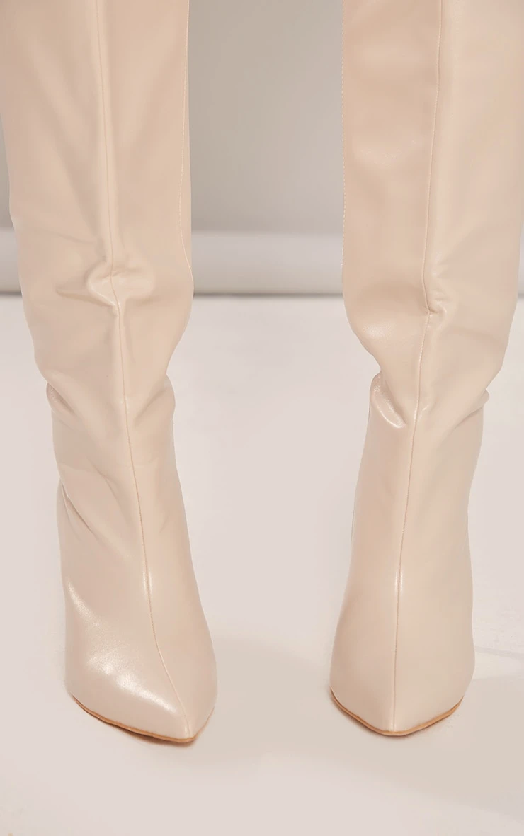 Prettylittlething Vanilla PU Point Toe Stiletto Heeled Knee High Boots Vanilla
