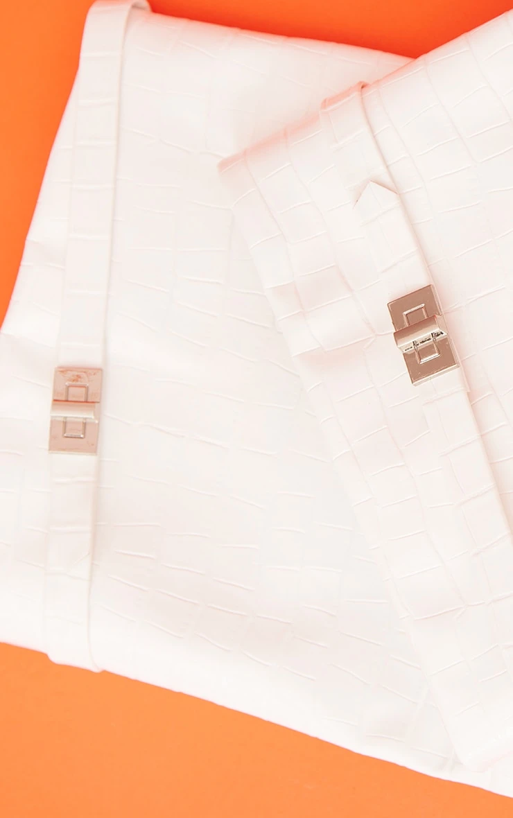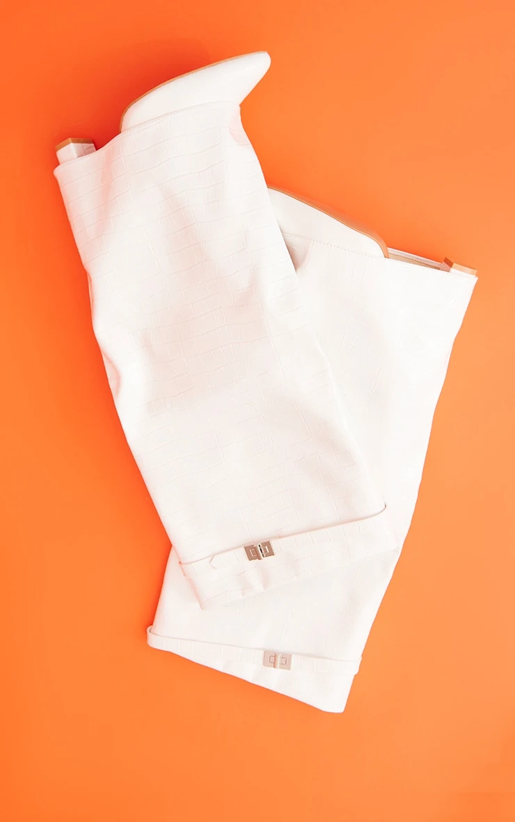 Get ready to make a statement in these heeled boots. Featuring a white PU patent croc material with a fold over the knee design and block heels, we’re obsessed. Just add to any look for a fierce finishing touch.