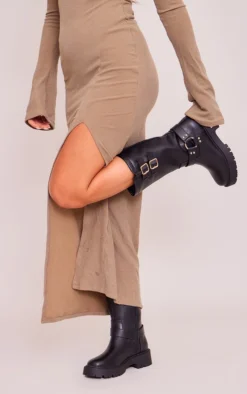 Prettylittlething Black Wide Fit Faux Leather Double Buckle Lace Up Platform Ankle Boots Black