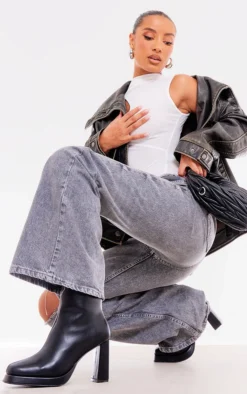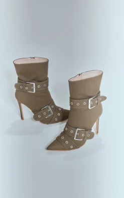 Prettylittlething Red Wide Fit Faux Leather Point Toe Buckle Strap Heeled Calf High Boots Red