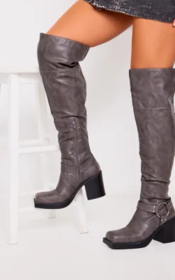 Prettylittlething Grey Faux Leather Square Toe Buckle Detailed Over The Knee Block Heeled Boots Grey