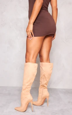 Prettylittlething Olive Faux Suede Point Toe Fold Over Buckle Strap Knee High Heeled Boots Olive